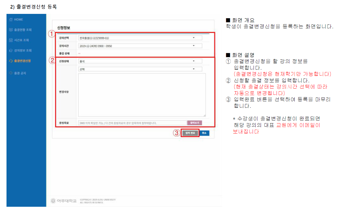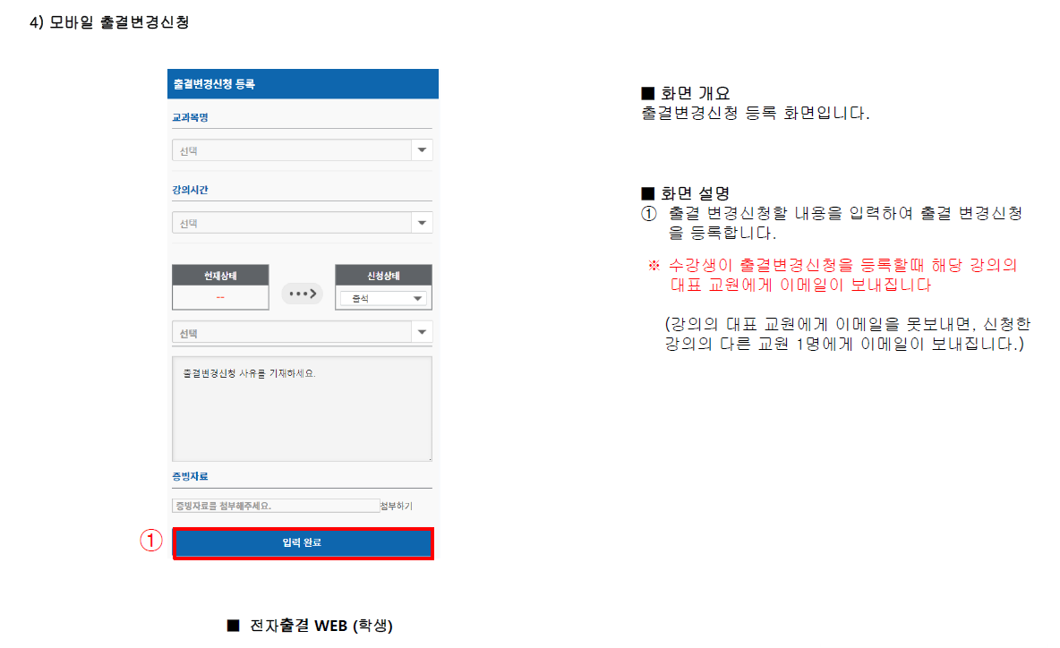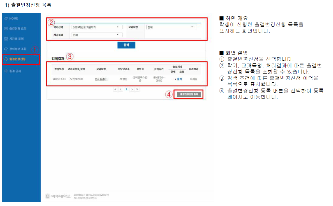 - 출결 변경 신청은 포털-전자출석부-출결변경신청 메뉴를 이용하시기 바랍니다.