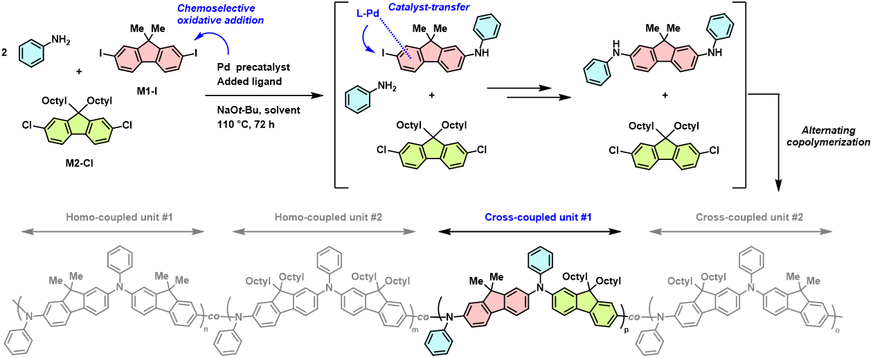 Image showing the synthesis process of sequence-controlled semiconducting polymers via sequential C–N coupling reactions