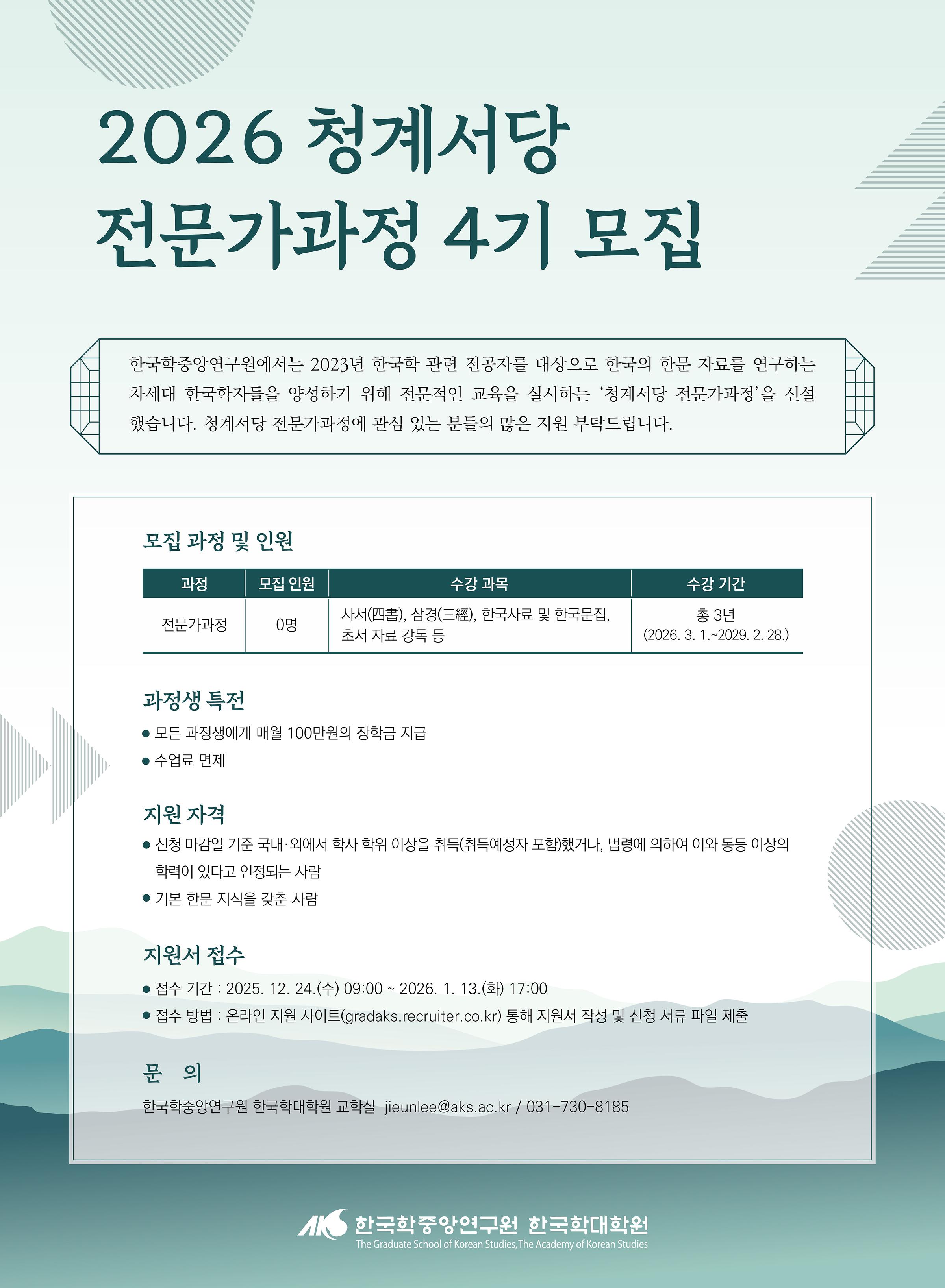[기타] 한국학중앙연구원 한국학대학원 2026년 청계서당 전문가과정 4기 모집