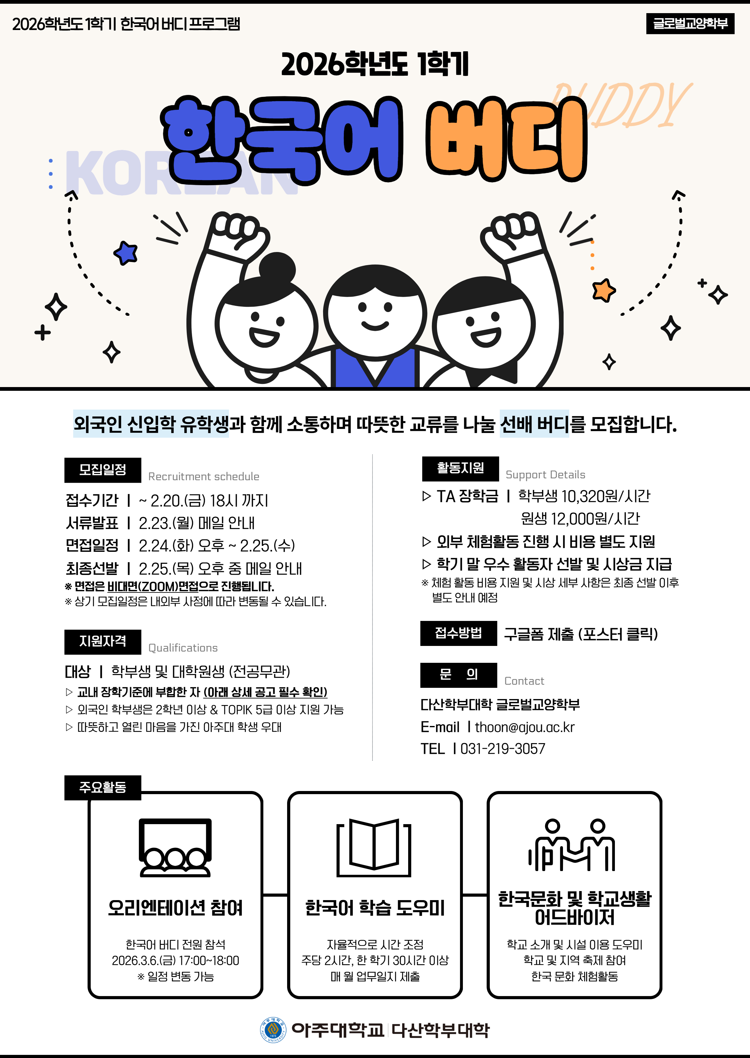 문의: 글로벌교양학부(thoon@ajou.ac.kr 또는 ☎ 031-219-3057)