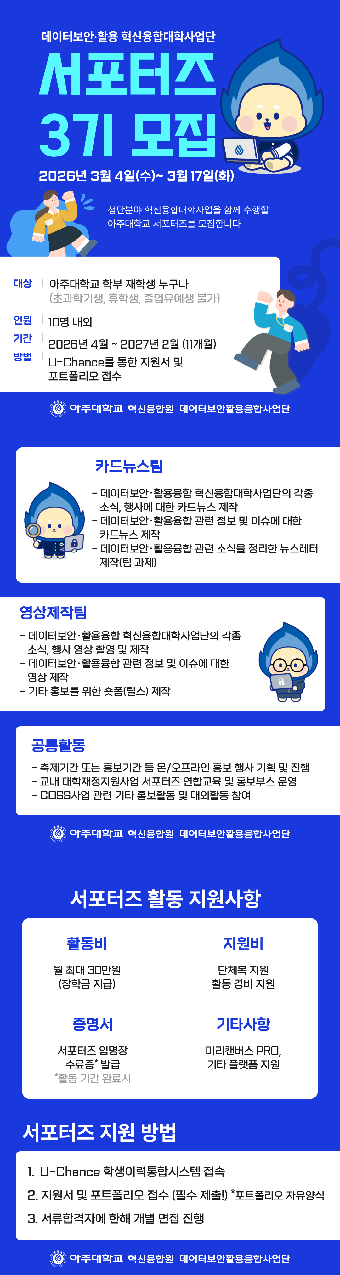 [๋น„๊ต๊ณผ] ๐Ÿ˜Ž ๋ฐ์ดํ„ฐ๋ณด์•ˆยทํ™œ์šฉ ํ˜์‹ ์œตํ•ฉ๋Œ€ํ•™์‚ฌ์—…๋‹จ ์„œํฌํ„ฐ์ฆˆ 3๊ธฐ ๋ชจ์ง‘ (~3/17(ํ™”))